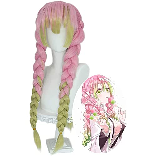 Anime rosa och grön peruk för Mitsuri Cosplay flätat hår Peruk med pigtails Halloween Party Peruk, Bra present till Halloween, Fest, Karneval, Nattliv, Konsert, Anime Fans,Red
