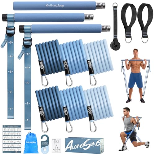 ALongSong Pilates Bar Set med 6 elastiska latexband 20-80 kg eller 13,6-108 kg och dörrankare pilatesutrustning för hemmagym, träningsutrustning
