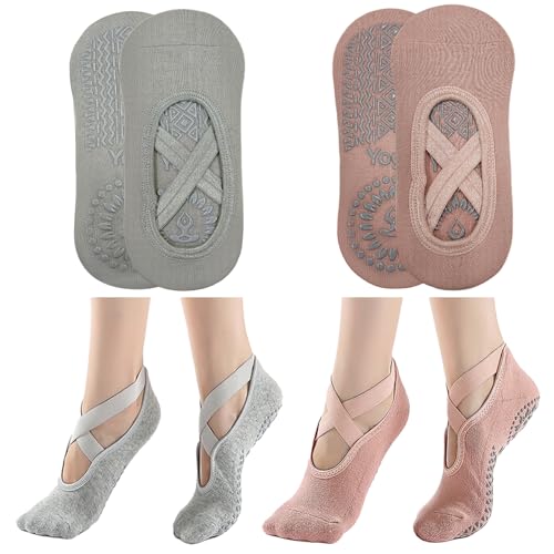 Hually Yoga-strumpor, 2 par yoga pilates strumpor för kvinnor med grepp och remmar, lätta att sätta på, bomull pilates strumpor för pilates, barre, balett, dans, barfota träning (svart och grå), Grå,