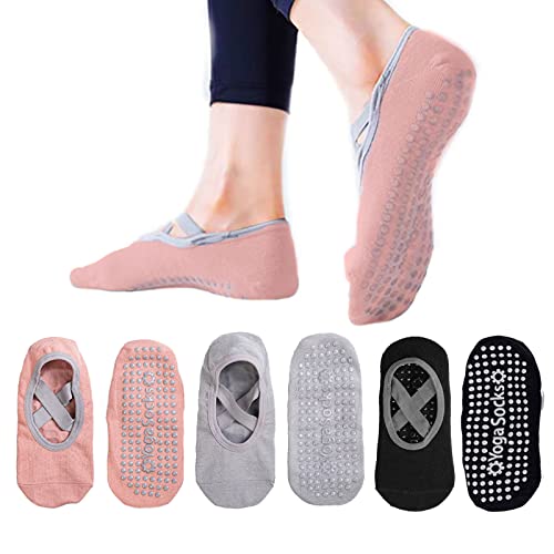 NITAIUN 3 par yogastrumpor för kvinnor halkfria, greppstrumpor med remmar halkfria strumpor för Barre Fitness Pilates Balett dans barfotaträning, en storlek svart grå, Grå, svart, 37-45 Große Größen