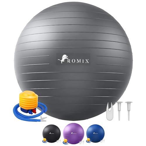 ROMIX Träningsboll, 65cm Anti-Burst Pilatesboll med Luftpump för Stabilitet och Balans, Extra Tjock Halkfri Ergonomisk Yogaboll för Fitness Fysioterapi Graviditet och Kärnträning på Hem (SILVER)