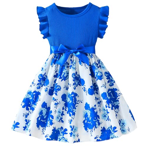 Codkkre Klänning för flickor Pilbåge Klänningar för barn Blommig Volanger ärmar A-linje Sommarklänning för flickor påsk Rund hals Blå ros 5 år