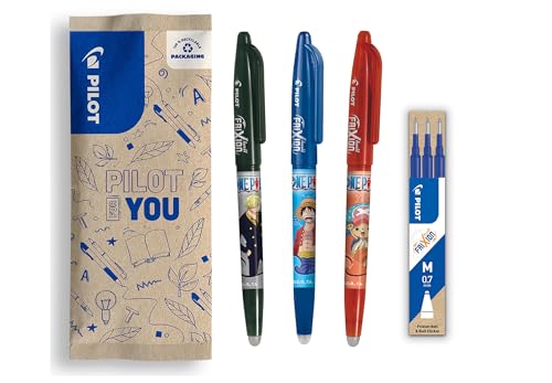 Pilot X ONE PIECE - Frixion Ball Plus 3 set, svart, blå, röd + 1 set med 3 blå påfyllningar + 4 klistermärken - raderbara pennor - One Piece begränsad upplaga - återvunnen plast - medium spets