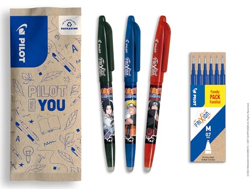 PILOT x NARUTO FriXion Ball 3-pack pennor, svart, blå, röd + 1 set om 6 blå påfyllningar - raderbara pennor - Naruto Shipudden Limited Edition - Uppladdningsbara rullpennor - blå - medium spets