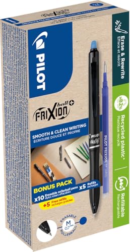 PILOT - Set med 10 FriXion Ball 07 Plus + 10 refill - raderbara pennor - infällbara och påfyllningsbara rullar - tillverkad av återvunnen plast - blå - medium spets