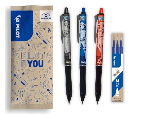 Pilot x One Piece Set med 3 Frixion Ball, svart, blå, röd + 1 set med 3 blå påfyllningar + 4 klistermärken - raderbara pennor - One Piece begränsad upplaga - uppladdningsbara rullpennor - medium spets