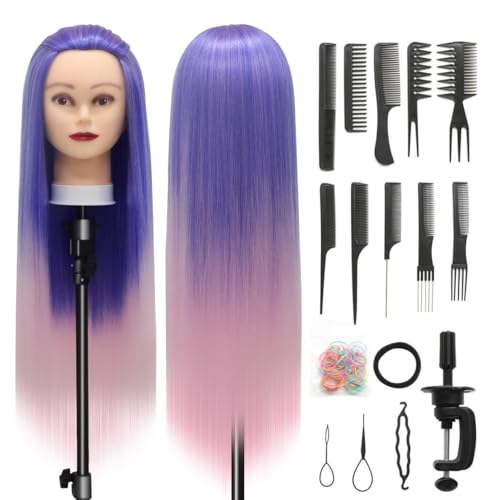Träningshuvud, 28 inch Frisörsträningshuvud 100% syntetisk fiber hår styling huvud, träningshuvud frisör huvud med gratis klämma och DIY flätning set (Blått Rosa)