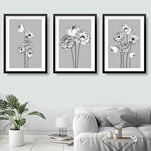 Artze Wall Art Pion blomma skandinaviska affischer blommor minimalistiska konstverk pioner galleri väggkonsttryck 3-delat set, A3-storlek, grå