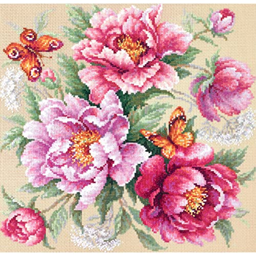 Magic Needle 140-001 ZW blomma magi. Pion korsstygnsset med räkningsmönster gren utgåva, bomull, vit, 30 x 30 cm