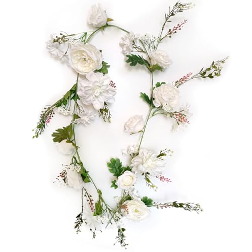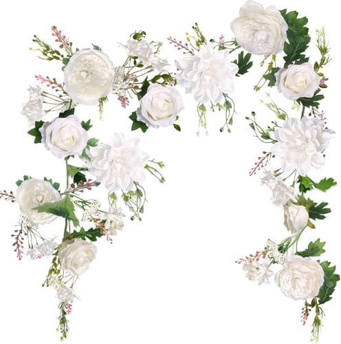Pion girlang, orgminne ros blomma vinstockar, 15 cm blommig girlang för bröllopsdekor hem bordslöpare mantel dekoration (elfenben pionkrans)