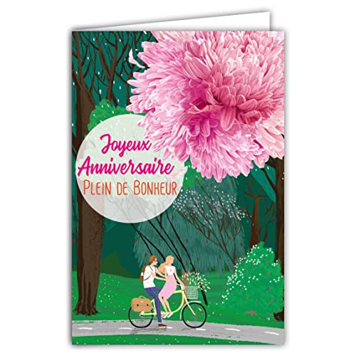 Afie 65-1334 Grattis på födelsedagen kort full av lycka för ung flicka kärleksfull kvinna illustration cykelpar rosa blomma pion skog - kuvert ingår - tillverkad i Frankrike