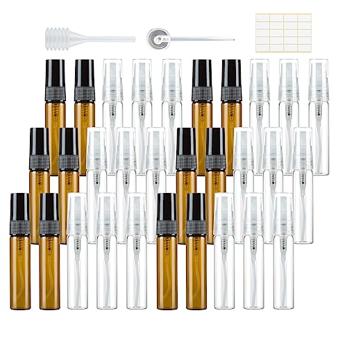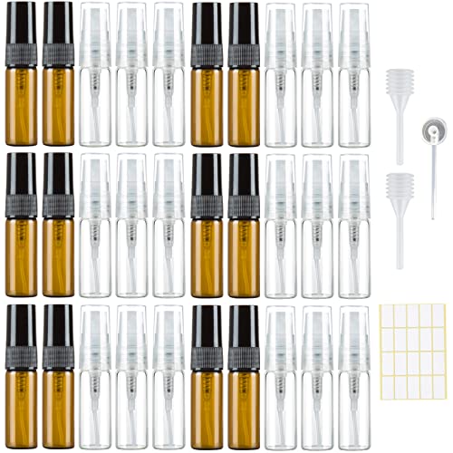30 stycken 5 ml parfymsprejflaska tom sprayflaska glas liten för fyllning, minipumppåsar parfymflaska påfyllningsbar parfymprover för resor transparent bärnsten med pipetter presshuvud