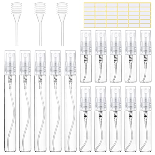 MELLIEX 15 stycken parfymsprejer, tom parfym, spridare, påfyllningsbar, resa, mini, bärbar sprayflaska med pipetter och presshuvud för resor, 3 ml/5 ml, transparent