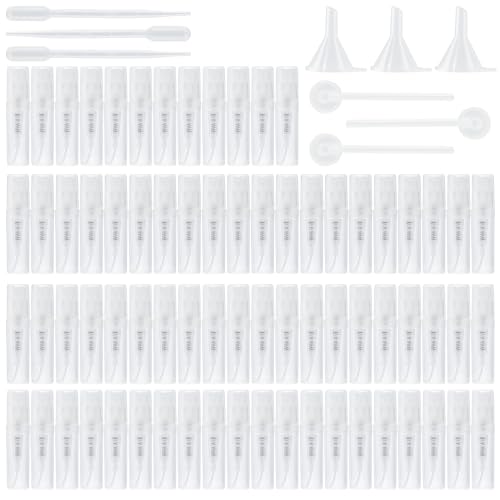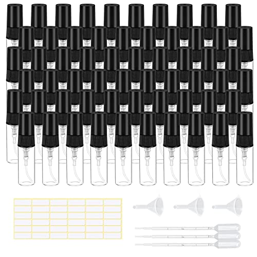 RVLZKCPG 50 stycken parfymsprejare för resor, 3 ml mini parfymsprejflaska påfyllningsbar, parfym, fyllmedel med 3 pipetter, 3 trattar, 3 pressar och 4 etikettark för resor och camping