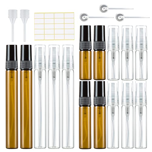 15 stycken parfymsprejsprutor, tom sprayflaska, glas, liten för fyllning, minipumppåsar, parfymflaska, påfyllningsbar parfymprover för resor, 3 ml/5 ml/10 ml transparent bärnsten med pipetter,