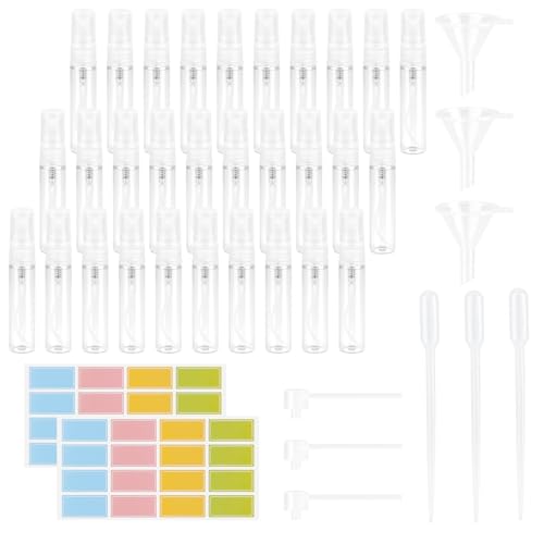 30 stycken 5 ml parfymsprejflaska påfyllningsbar parfymsprejflaska för resor små sprayflaskor för fyllning parfym fyllmedel mini sprayflaska transparent glas med tratt pipetter etikettdekal