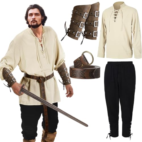 Herrrenässanskostym, 5 delar, medeltida, retro, viking, långärmade skjortor, ankelband, byxor, PU-läderspänne, armskena, vikingbälte, tillbehör för halloween, pirat, hippie, cosplay, fest, M