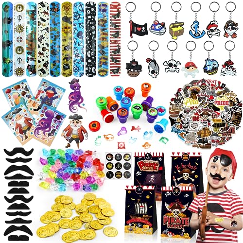 BOIKOKY 206 delar piratfest gynnar tillbehör, pirat födelsedagsfest dekorationer, piratfest godispåsar med klistermärken nyckelring mustascher frimärken guldmynt ädelstenar för barn pojkar