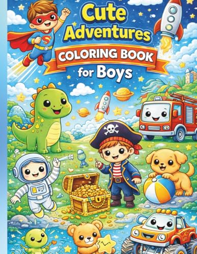 Cute Adventures Coloring Book for Boys: Fun and Simple Coloring Pages with Superheroes, Dinosaurs, Vehicles, Pirates & Space Adventures For Kids Ages 3–6