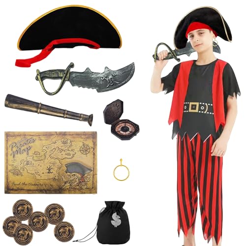 Rabtero Barn piratutklädning, pojkar piratdräkt med pirathatt, ögonlapp, piratutskärning för barn 7-8 år