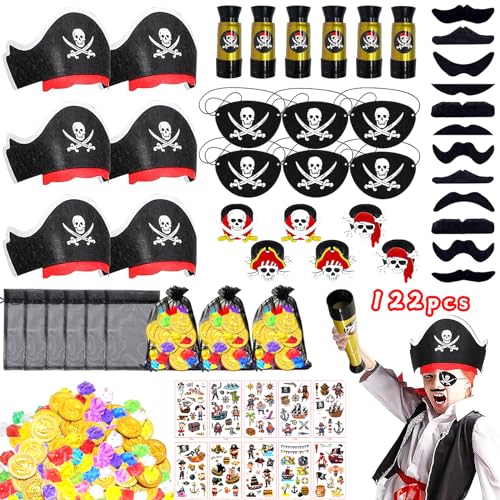 122 st pirat- och födelsedagsfest tillbehör, pirathatt, piratögonlappar, piratteleskop, guldmynt och ädelstenar, för piratfest, halloweenfestfavoriter jul