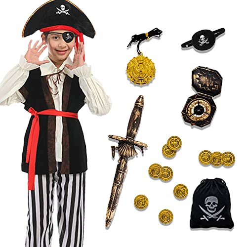 YIMOJOY Pirat kostym för barn med pirathatt tillbehörsset, 9 delar piratdräkter halloween barn piratdräkt cosplay karneval kostym (M)