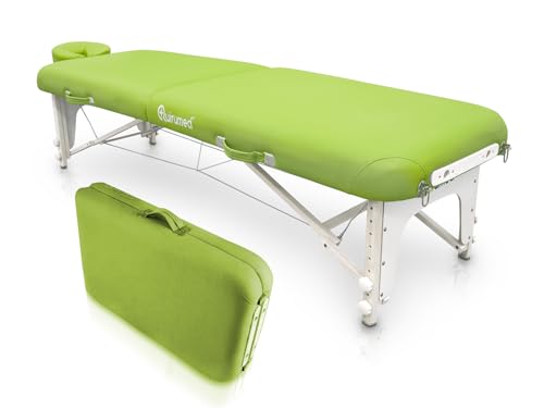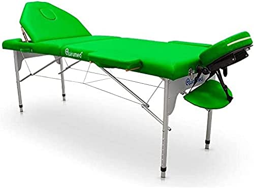 QUIRUMED Pro Aluminium hopfällbart massagebord, 186 x 66 cm, med hopfällbart ryggstöd, Pistagegrön färg, Läder, Ansiktshål, Avtagbart huvud, Höjdjusterbart, 2 sektioner, upp till 150 kg