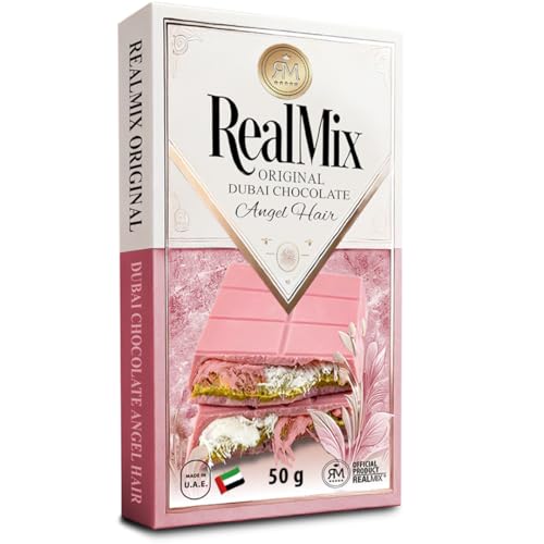 REALMIX Rosa Choklad från Dubai – Mjölkchoklad med Hallonsmak, Sockervadd, Pistagenötter & Kadaif-fyllning – Premiumkvalitet – Handgjord i Förenade Arabemiraten (50g, Rosa Choklad)