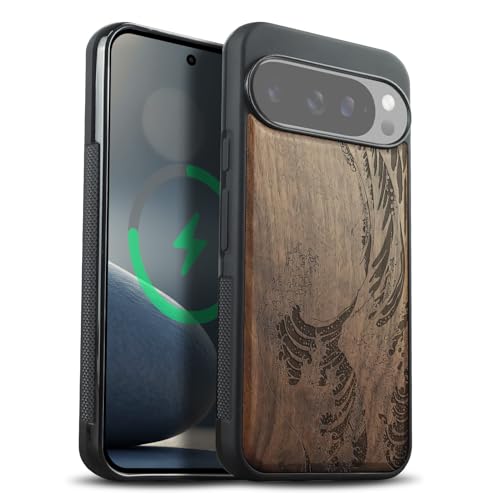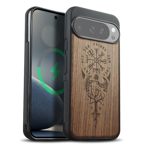 Carveit Träfodral för Google Pixel 10 [Naturligt trä & svart mjuk TPU] Magnetisk fodral för Pixel 10 Case (valnötsträ-Vikingkompass)