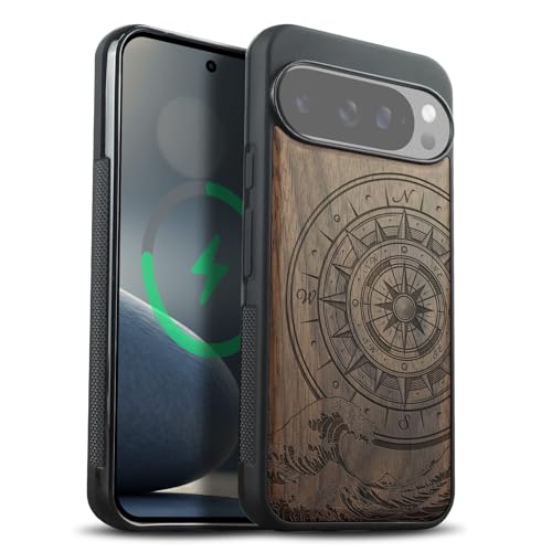 Carveit Träfodral för Google Pixel 10/10 Pro [Naturligt trä & svart mjuk TPU] Magnetisk fodral för Pixel 10/10 Pro Case (valnötsträ-Kompassen och Vågen)