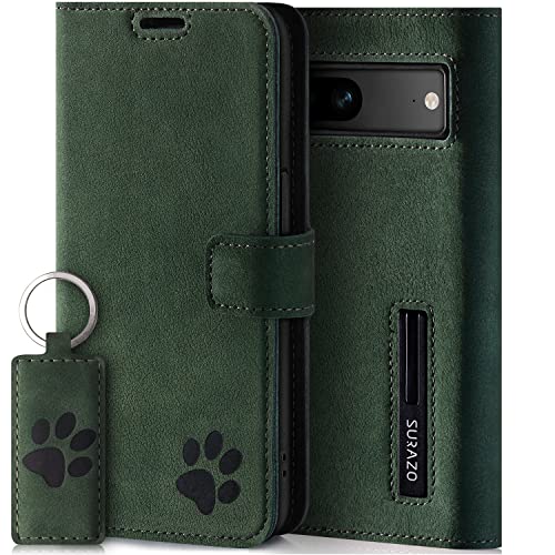 SURAZO Plånboksfodral för Google Pixel 8, fodral i läder – äkta läder, skyddsfodral med tass-motiv – RFID-hopfällbart skal [magnet, stativfunktion, kortfack] Flip Cover Case läderfodral (mörkgrön)