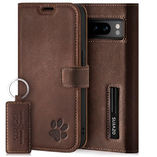SURAZO Plånboksfodral för Google Pixel 8 Pro fodral läder – äkta läder skyddsfodral med tasmotiv – RFID-vikbart fodral [magnet, stativfunktion, kortfack] Flip Cover Case läderfodral (nötbrun)