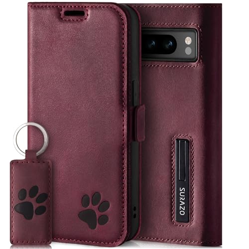 SURAZO Slim Magnet mobiltelefonfodral för Google Pixel 8 Pro fodral läder – äkta läder, skyddande tass-motiv – RFID-vikbart fodral [stativfunktion, kortfack] flip cover case läderskal (vinröd)