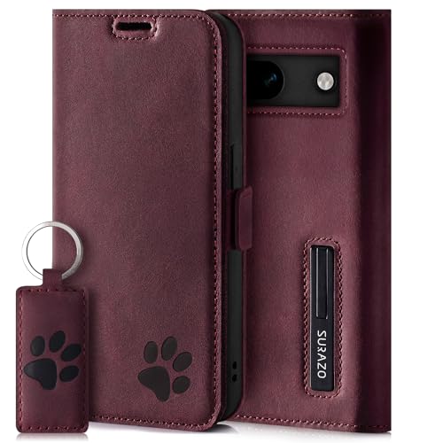 SURAZO Slim Magnet mobiltelefonfodral för Google Pixel 8a fodral läder – äkta läder skyddande tass-motiv – RFID-hopfällbart skal [stativfunktion, kortfack] flip cover case läderskal (vinröd)