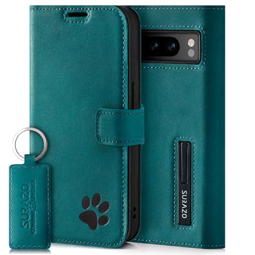 SURAZO Plånboksfodral för Google Pixel 8 Pro fodral läder – äkta läder skyddsfodral med tasmotiv – RFID-vikbart fodral [magnet, stativfunktion, kortfack] Flip Cover Case läderfodral (turkos)