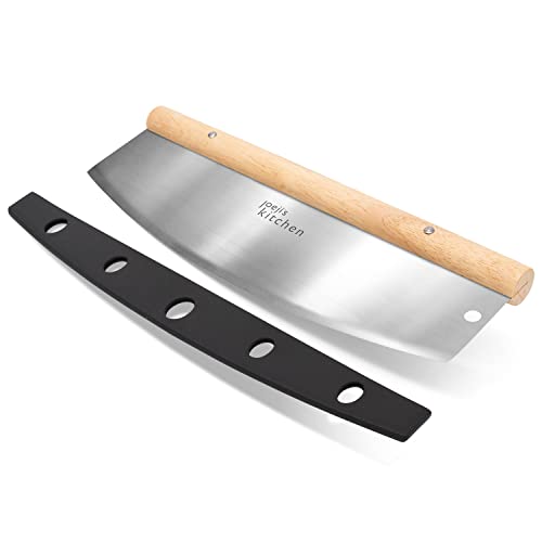 Joeji's Kitchen Stainless Steel Large Pizza Cutter Rocker 33.5cm Knife Mezzaluna Chopper with Solid Wood Handle Multiuse Rocking Knife to Effortlessly Cut Pizza Bread Herbs Vegetables Chocolate & More