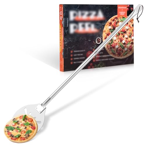 Homikit Pizzaspade, 22,8 x 25 x 112 cm rostfritt stål perforerad pizzaspade, pizzaspade med avtagbart metallhandtag för enkel glidning, pizzasten, med runda kanter för ugn, grill, stenugn