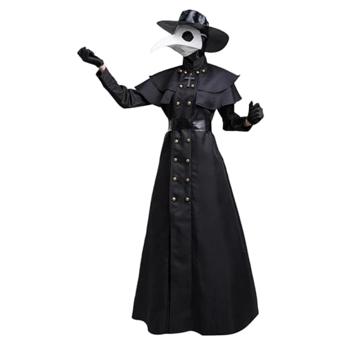 Abitoncc Plague Doctor kostym vuxen plågläkare mask, svart mantel med huva, läderhandskar, kråka rekvisita, steampunk läder lång näsa fågelmask för halloween plague doktorsmask kostym vuxna kvinnor