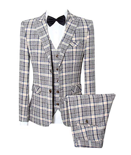 MOGU Mens 3 Piece Slim Fit Plaid Suit Blazer+Vest+Pants US Size 42 Ivory