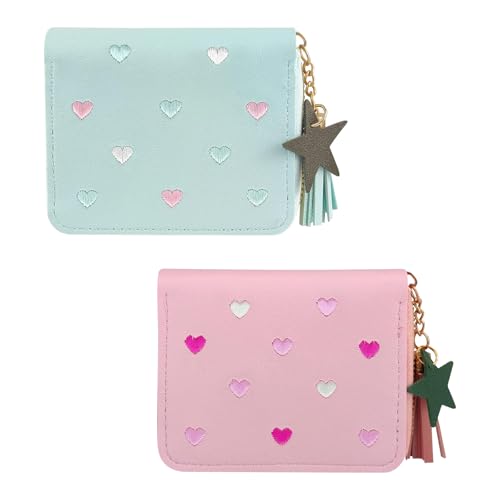 2 stycken små plånbok dam, PU miniplånbok damer, plånbok barn flickor mjuk, barnplånbok med dragkedja, broderihänge för barn flickor födelsedagspresent (blå rosa), röd, 4.3in*3.3in, Modern