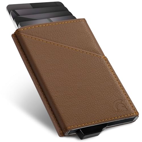 Powr RFID Korthållare I Brunt Veganläder - Minimalistisk Plånbok för Kort och Sedlar - Slank Aluminium Kortplånbok Med Pop-Up Mekanism - Stilren Kortinnehavare för Herrar och Damer