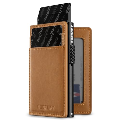 DUGRAFT Slim Korthållare för 10 Kort med POP-UP Kortfodral i Aluminium, RFID-blockering, ID-fönster och 4 Kortplatser, Minimalistisk Plånbok i Framficka för Män, Kaffe