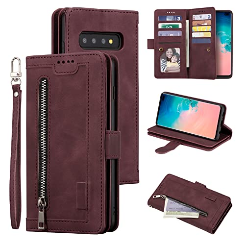 EYZUTAK Fodral för Samsung Galaxy S10, läderfodral med magnetisk dragkedja plånbok med 9 kortplatser funktion stativ matt läderfodral retro mörkröd