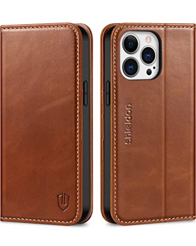 SHIELDON Plånboksfodral för iPhone 13 Pro Max 5G, äkta läder foliofodral [magnetisk] [stötdämpande] [RFID-blockering] [Kreditkortsplatser] [kickstand] kompatibel med iPhone 13 Pro Max 6,7 tum, retro