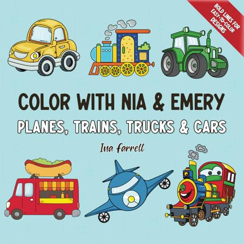 Color With Nia & Emery Planes, Trains, Trucks & Cars: Bold and Easy Coloring Book Featuring Cool Modes of Transportation for Adults, Teens & Kids