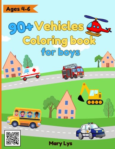 90+ Vehicles Coloring book for boys Ages 4 - 6: Fun and simple design of cars, vehicles, trucks, planes, trains, boats and more, for preschool boys.