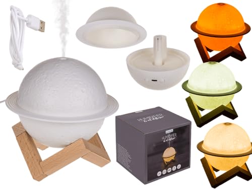 Luftfuktare/oljediffuser, planet, med trästativ, 3 ljusnivåer och USB-kabel, för ca 110 ml, ca 13,8 x 10,5 cm, tillverkad av plast, i presentförpackning