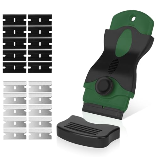 Flintronic Skrapa med ett huvud med 20 blad (10 i rostfritt stål och 10 plast), multifunktionsrengöringsset för fönster, speglar, kakel-grön