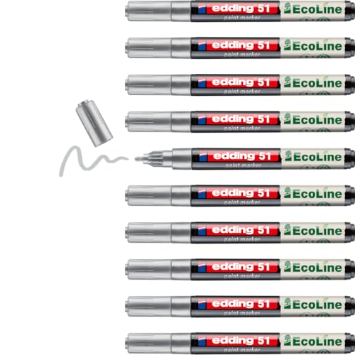 edding 51 EcoLine färgmarkör – silver – förpackning med 10 – rund spets 1–2 mm – vattenbaserat bläck, mycket ogenomskinlig och vattentät – penna för glas, sten, trä, plast och papper