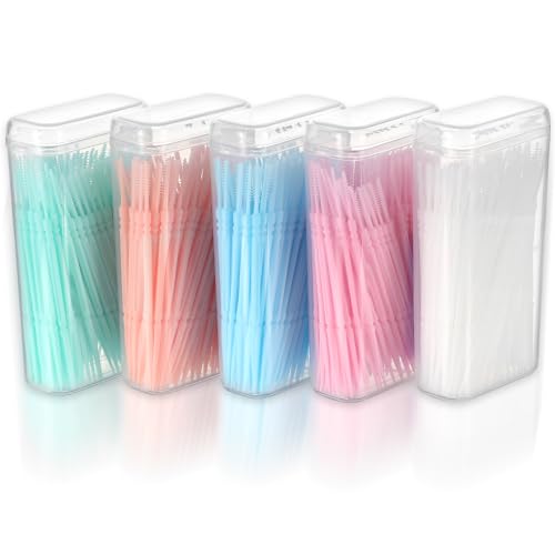 Ptwola 500 x 2-i-1 engångsplast dubbelhuvud mellanrumsborstar plast flerfärgade tandborstar för tandvård tandpetare munhygien (paket med 5, 50